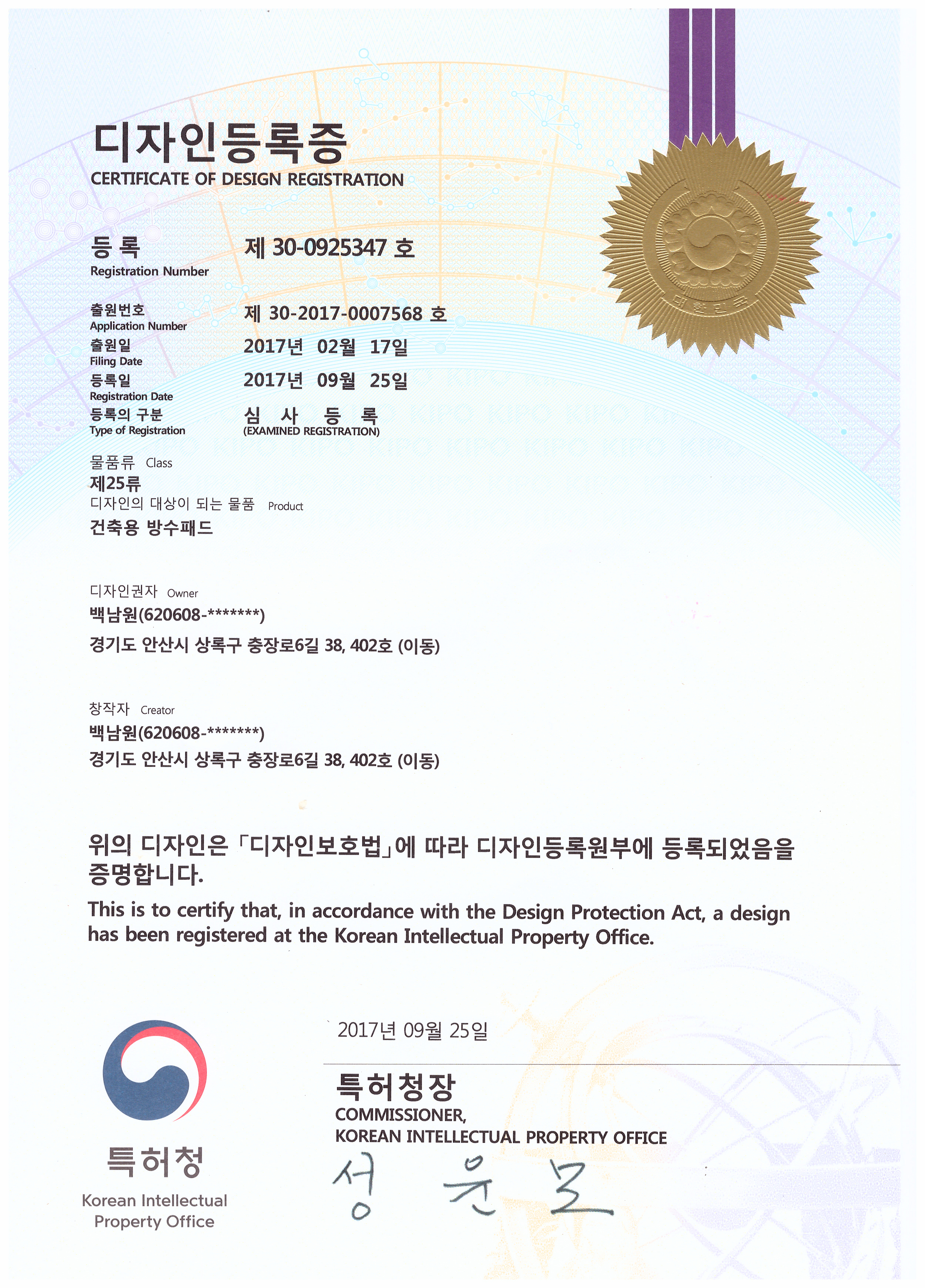 디자인 특허 등록증
